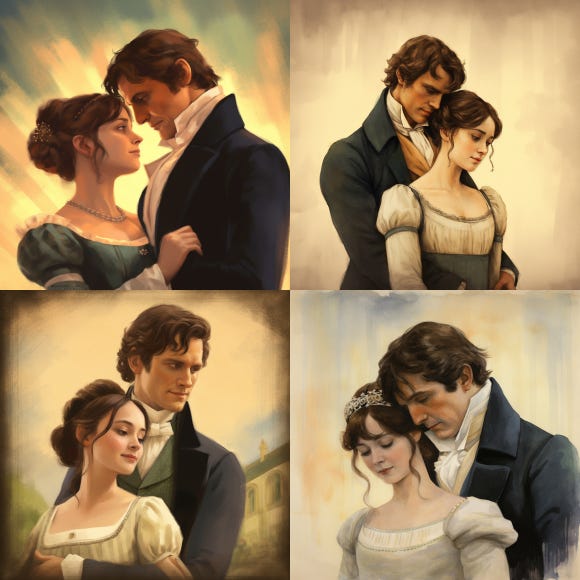 I used an AI bot to make the following pics of Mr. Darcy and Elizabeth Bennet. Which one is your favorite?